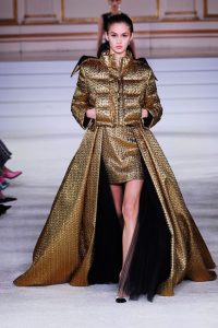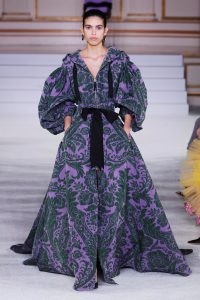 La opulencia no tiene por qué ir en detrimento de la comodidad y la modernidad. Un vestido de punto hasta el suelo está adornado con cristales de Swarovski que brillan con luz tenue. Un amplio vestido en forma de dramático anorak con capucha está confeccionado en decadente chine chine, confeccionado con hilos estampados por urdimbre en morado oscuro y verde esmeralda.