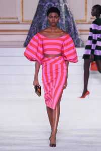Las rayas geométricas cobran protagonismo en una miríada de meticulosas construcciones, prendas de punto y drapeados. Las prendas de día, como la característica camisa blanca de algodón de Carolina Herrera o el pequeño vestido blanco de lentejuelas y tweed, confieren a la mujer una innegable fuerza de presencia