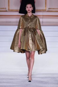 La rigidez de la corte de los Habsburgo, en contraste con la libertad y el romanticismo por los que luchaba Sisi de disciplina mezclada con exuberancia y grandeza en toda la colección. Los vestidos con escotes retrato y románticos pliegues en espiral sitúan a la mujer Carolina Herrera en el centro de atención. La vívida paleta de colores en tonos joya se basa en suntuosas texturas de terciopelo y tafetán en negro, doradas con bordados dorados.