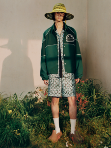 Un nuevo monograma de puntillismo, que imita la técnica de pintura impresionista, da la ilusión de un movimiento submarino. Aparece como estampado en pantalones cortos y camisas de mezcla de seda y crepé, en prendas de punto, en una bomber jacquard y en un traje generacional en denim desgastado. Motivos similares abundan en una camiseta sin mangas extragrande con lentejuelas adornada con un logotipo inspirado en las algas, en una camisa y una camisa cargo en denim índigo con un monograma en relieve que evoca la erosión del agua, y en camisas adornadas con detalles estampados transparentes de aspecto húmedo. Esta chaqueta de satén, combinada con una camisa de popelina y un short de baño a juego, está repleta de motivos y logotipos submarinos tridimensionales y está adornada con lentejuelas de efecto líquido. Como alternativa al sirsaca, se ha adaptado un jacquard a una forma superligera y se ha empleado en un traje corto de color caqui, así como en camisas y pantalones cortos con mini monograma.