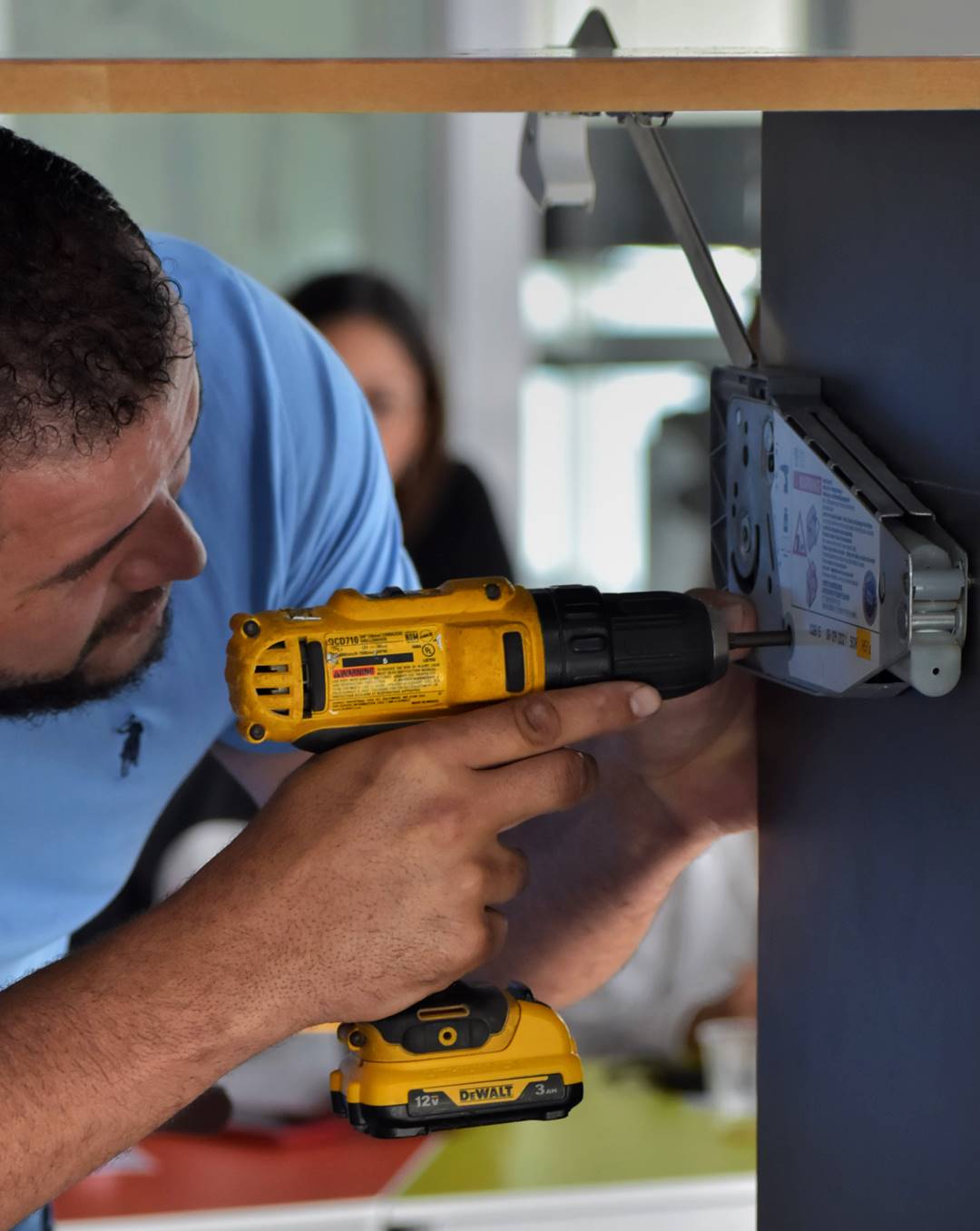 Las Capacitaciones DB son jornadas de formación teórico-prácticas alineadas con el propósito de DB group de fortalecer el sector del mueble en nuestro país, en las que cada asistente es guiado personalizadamente en la selección y manipulación de los herrajes técnicos para su correcta instalación.