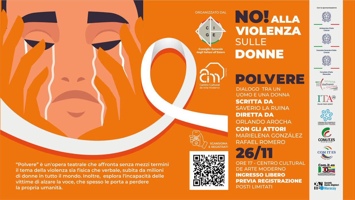 +SN.- El Consejo General de los italianos en el Exterior (CGIE) conmemorará el Día Internacional para la Eliminación de la Violencia Contra la Mujer con la puesta en escena de Polvo, diálogo entre un hombre y una mujer, del dramaturgo Saverio La Ruina, para exponer este problema de salud pública de alcance global bajo los reflectores del Centro Cultural de Arte Moderno, de Caracas, en una única función el domingo 26 de noviembre, a las 5:00 pm.