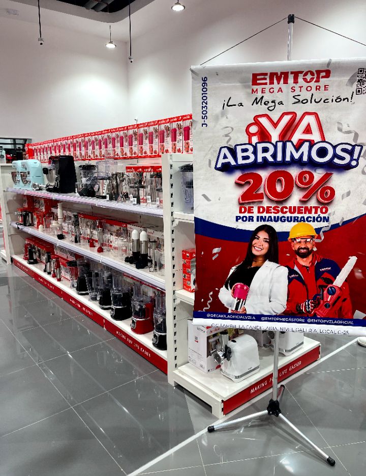 Emtop Mega Store es el nombre de la nueva tienda de ferretería y artículos para el hogar, ubicada en el nivel Galería del Centro Comercial Sambil La Candelaria. En el showroom se puede adquirir un amplio catálogo del ramo ferretero, que incluye desde herramientas eléctricas, manuales, maquinaria manual, jardinería, carpintería, seguridad industrial, entre otros. Mientras que en cuanto artículos del hogar, con la marca Decakila tienen a la venta electrodomésticos, línea blanca, griferías, articulos para el cuidado personal y más.