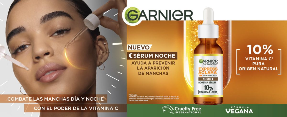 - Express Aclara Booster Serum Noche de Garnier, duplica el poder de la Vitamina C para una piel luminosa, suave y libre de manchas