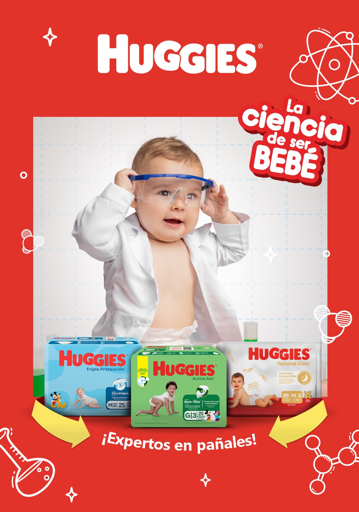El portafolio de Huggies está compuesto por su línea de pañales: Natural Care (Línea Roja), Active Sec (Línea Verde) y Triple Protección (Línea Azul), más su línea de toallitas húmedas. La campaña de “La ciencia de ser bebé” tendrá presencia en redes sociales, medios audiovisuales y en los distintos puntos de venta del país donde están disponibles los pañales Huggies.