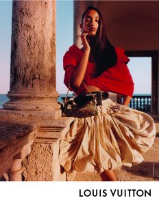Las evocadoras imágenes de Hawkesworth retratan a las modelos en poses tanto estáticas como dinámicas, evocando una sensación de escapismo y el espíritu de viaje inherente al ADN de Louis Vuitton. La campaña encapsula la esencia de la visión Crucero de Ghesquière, creando una interacción entre pasado y presente, moda y arquitectura.