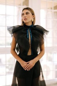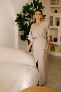 Con este reciente trabajo, Nathalia Forkin quiere cautivar a la mujer que es libre, audaz, romántica y delicada, pero que no teme mostrar su fuerza con una propuesta urbana y elegante. En los nuevos looks, que funcionan tanto para el día como para la noche, utilizó tejidos como la seda, lino, encaje, organza, hasta crepé y gabardina, en la paleta de colores seleccionó los tonos tierra, blancos, azules, verdes profundos y negros con dorados, los tonos ocres y crudos naturales, que reflejan la conexión con lo atemporal y lo versátil.