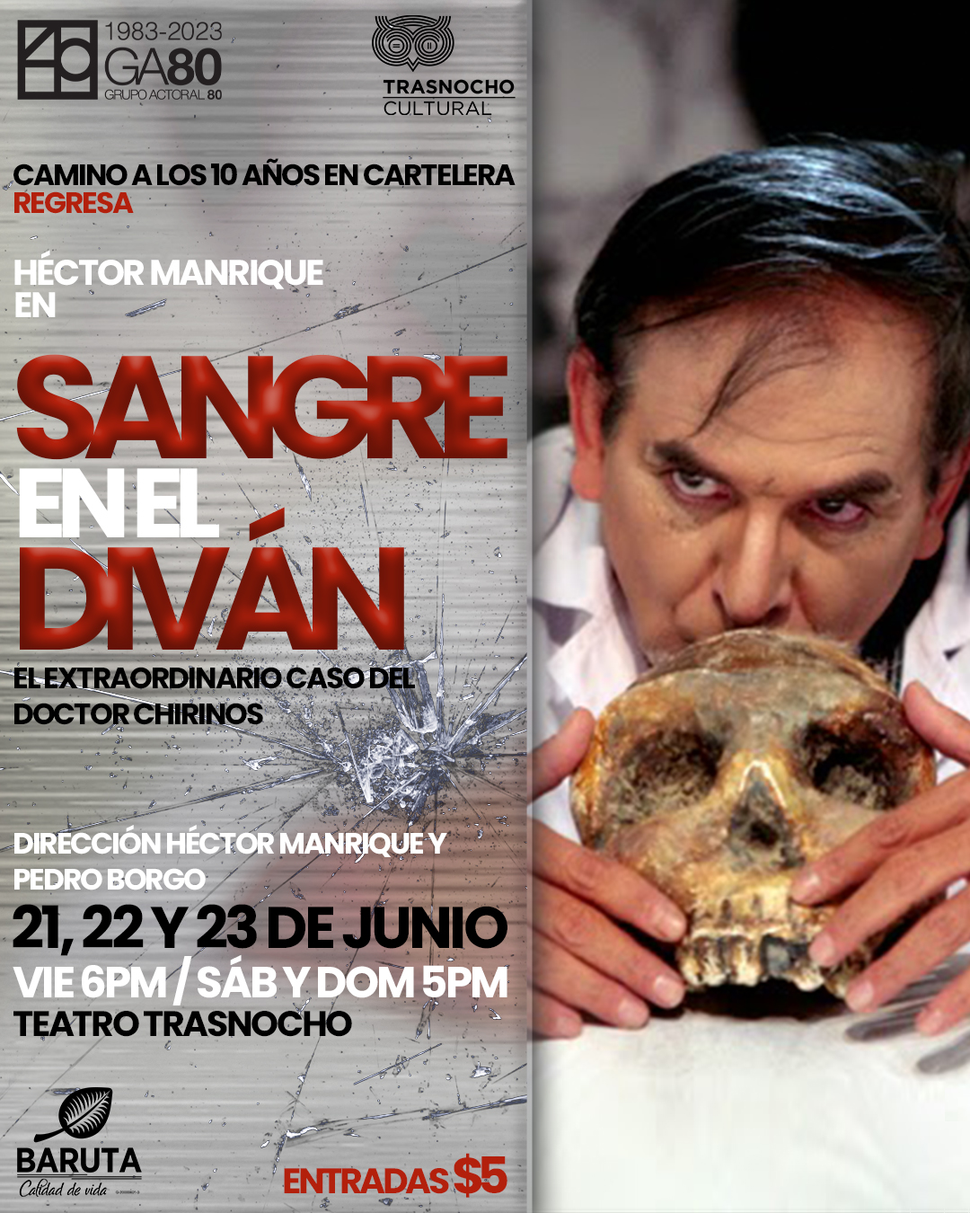 Luego de funciones a sala llena y agotadas en lo que va de 2024, año en el que celebrará una década de presentaciones a nivel nacional e internacional, regresa solo por tres funciones especiales al Trasnocho Cultural, el exitoso monólogo “Sangre en el diván”, protagonizado por el actor y director Héctor Manrique; con presentaciones este viernes 21 de junio a las 6:00 pm, sábado 22 y domingo 23 de junio a las 5:00 pm en el Teatro Trasnocho, con promoción de precio especial “solidario” a cinco dólares (5$) la entrada o su equivalente en moneda nacional, que ya se pueden adquirir en la taquilla del teatro ubicado en el C.C. Paseo Las Mercedes o por la página web: Ticketmundo.com.ve (@ticketmundo_ve).